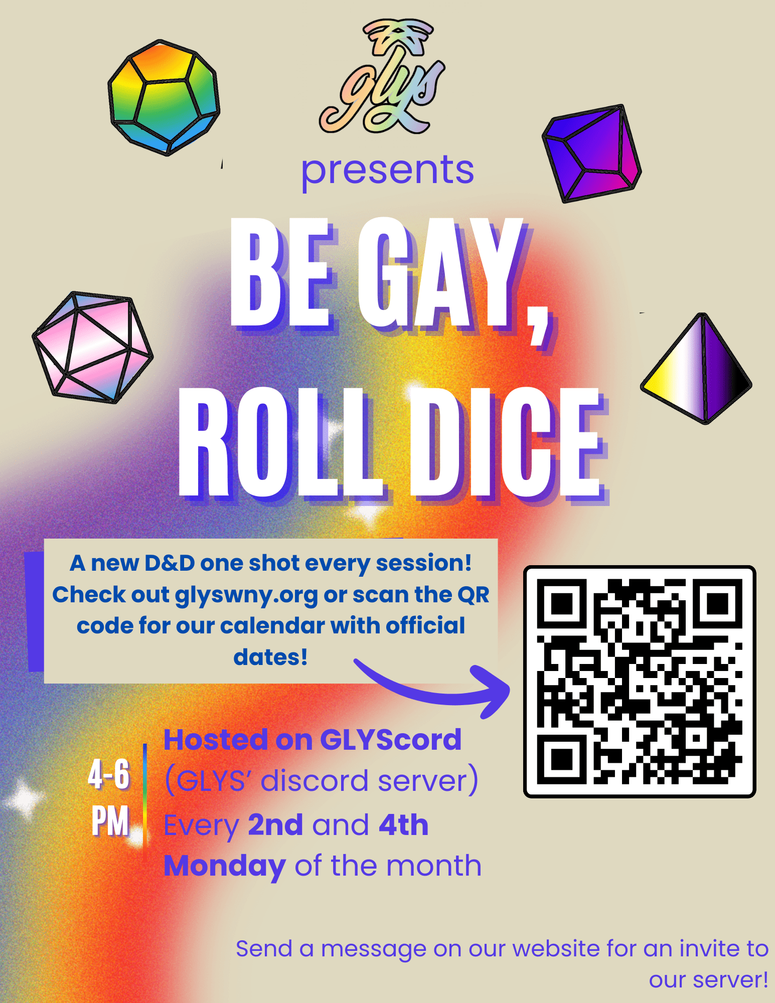 A new D&D One-Shot Adventure is available every session! Check out glyswny.org or scan the QR Code on the flyer for our calendar with the official dates!