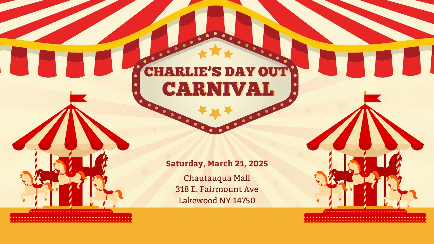 Come join us at the Chautauqua Mall for the 2nd Annual Charlie’s Day Out Carnival! This is a FREE family friendly carnival with games and prizes for all.