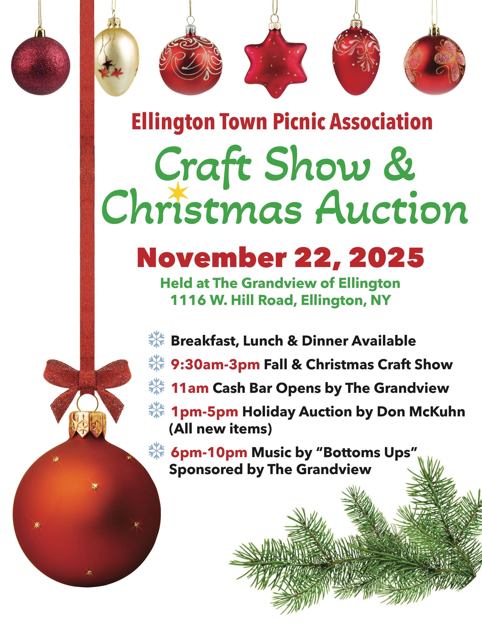 Ellington Town Picnic Association is holding the 2nd annual Craft Show & Christmas Auction at The Grandview. There will be breakfast, lunch, and dinner by Heart & Soul Cafe. Bar will open most of the day. The band Bottoms Up will close out the evening from 6-10!! Only craft show in the area with food, alcohol, a Christmas auction and a band! Let’s go!!!
