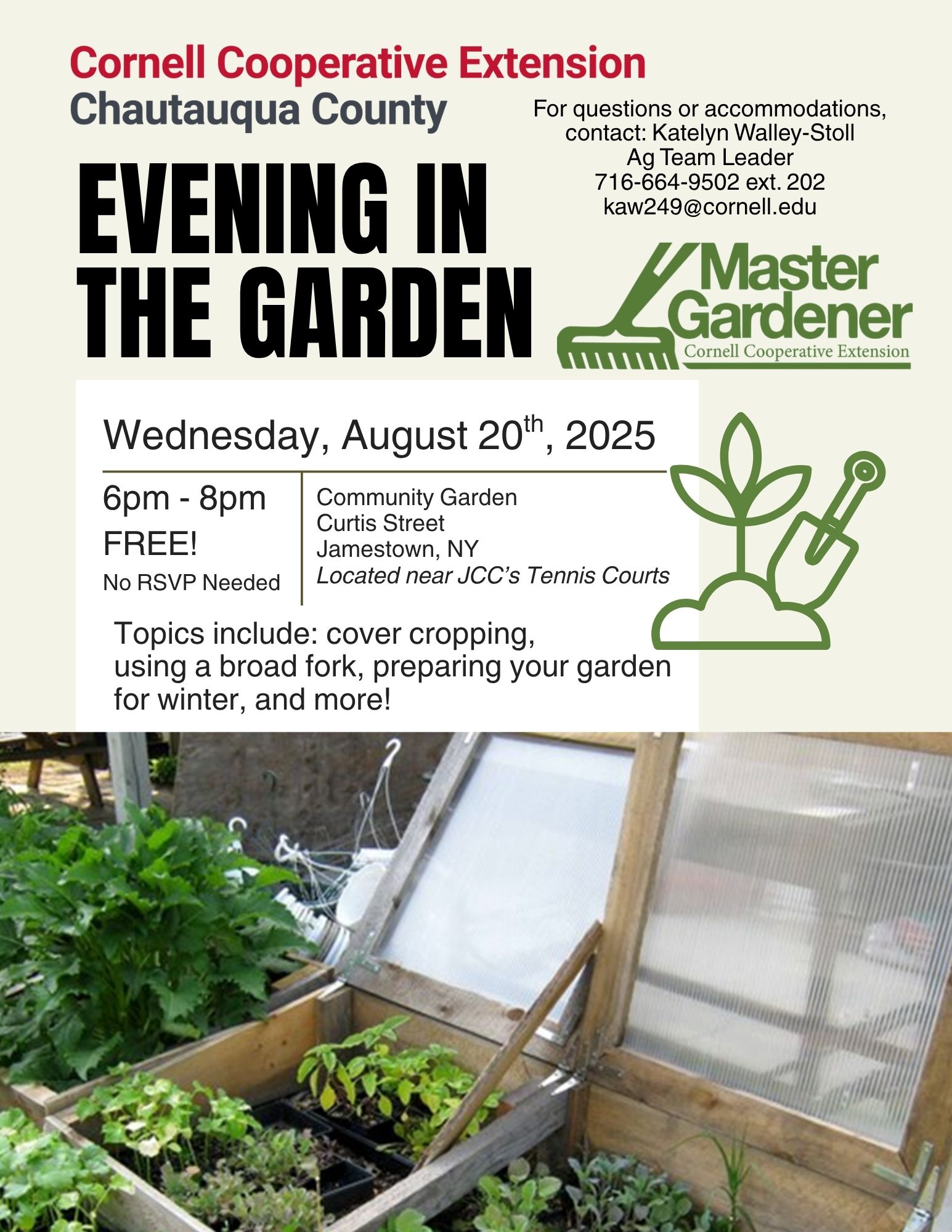 The Cornell Cooperative Extension and the Chautauqua County Master Gardeners are teaming up for an Evening in the Garden. You’ll learn about cover cropping, using a broad fork, preparing your garden for winter, and more!