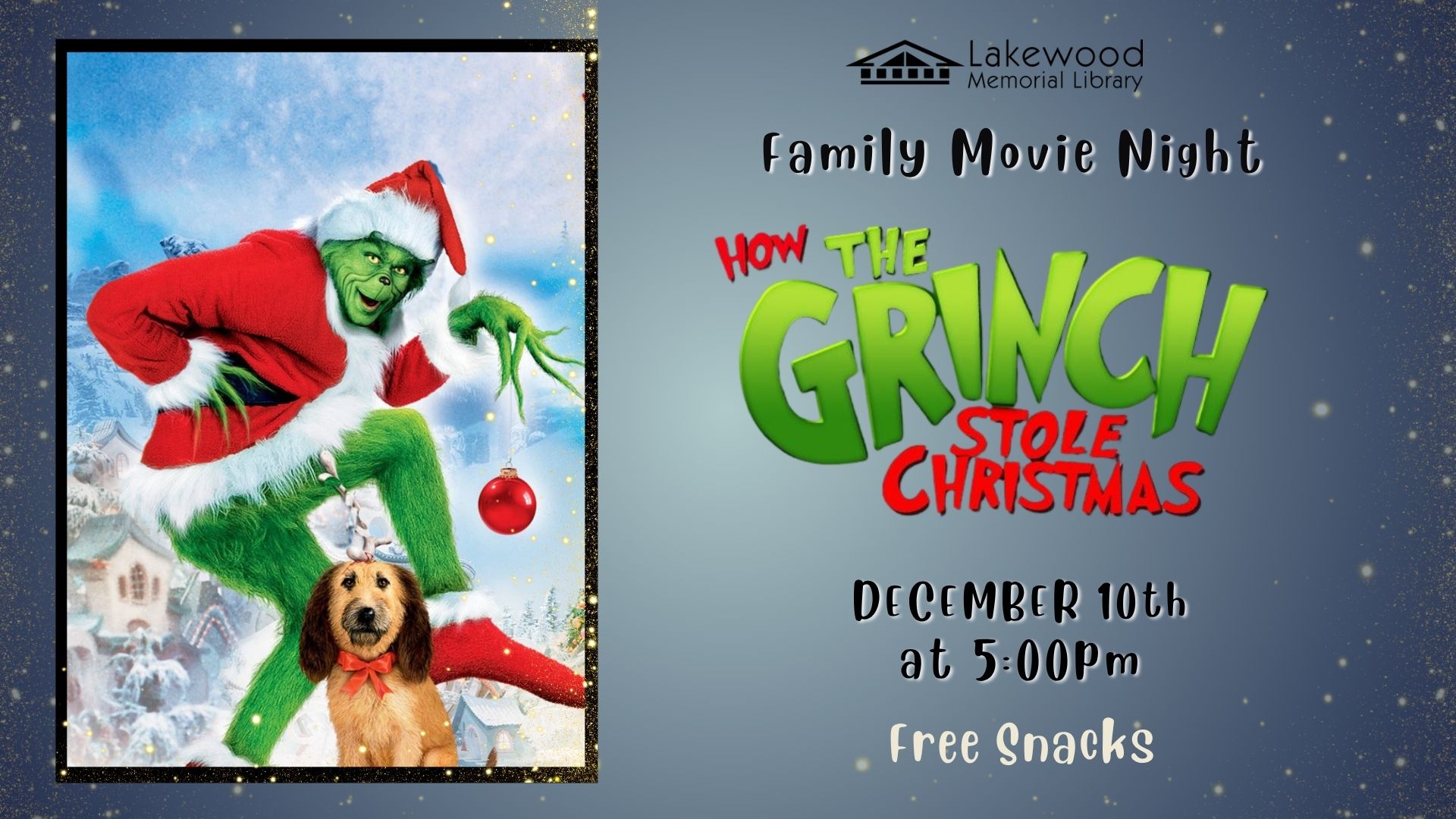 Join us for Family Movie Night on Wednesday, December 10th at 5 PM as we screen How the Grinch Stole Christmas starring Jim Carrey. Enjoy a cozy evening with free freshly popped popcorn and drinks while watching this holiday favorite. All ages are welcome!