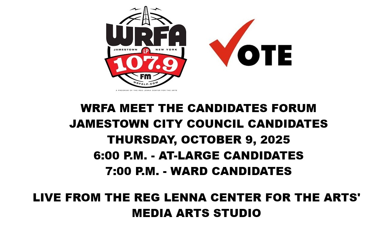 WRFA 107.9FM will once again present the candidates who are participating in contested races for the 2025 Jamestown City Council elections in a special Meet the Candidates forum, scheduled for Thursday, October 9, 2025 at the Reg Lenna Center for the Arts’ Multimedia Studio.
