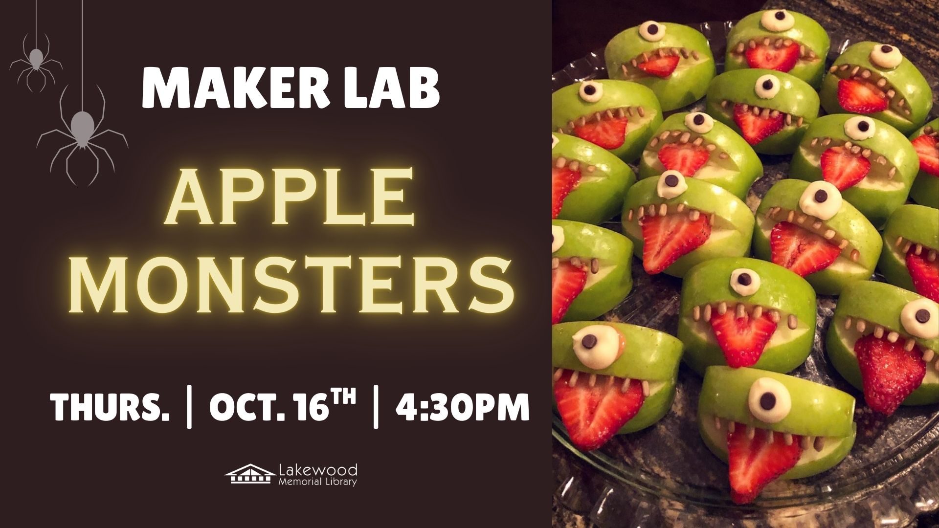 Join us in the Maker Lab on Thursday, October 16th at 4:30 PM for a spooky, hands-on adventure! We’ll be slicing up apples and strawberries to create fun and frightful apple monsters just in time for Halloween. This creative activity is perfect for all ages—come play with your food and bring your spooky snacks to life!