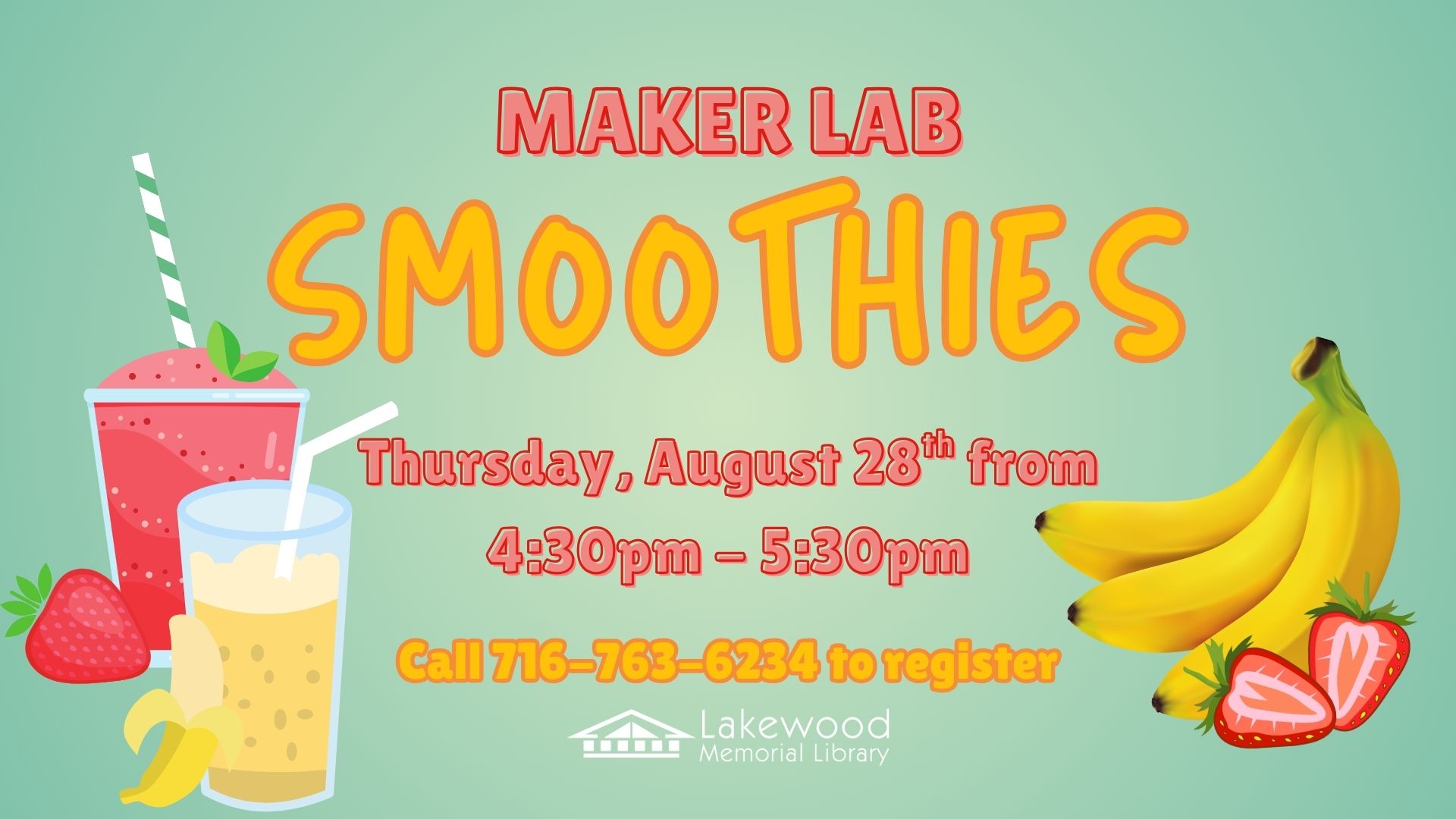 Join us for a deliciously fun Maker Lab on Thursday, August 28 from 4:30 PM to 5:30 PM, where we’ll be making our own smoothies! Choose from tasty ingredients like bananas, strawberries, peanut butter, and chocolate chips to create your perfect blend. All supplies will be provided. Registration is required for this program so call 716-763-6234 this is perfect for ages 6-12.