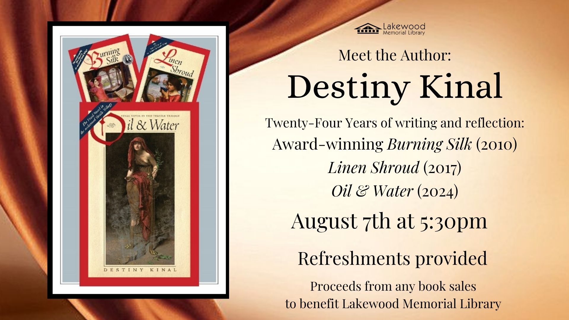 Join us for an evening with award-winning author Destiny Kinal as she shares insights and readings from her acclaimed Textile Trilogy: Burning Silk, Linen Shroud, and Oil & Water. With 24 years of writing and reflection, Kinal explores themes of matrilineality, utopian communities, the Arts and Crafts movement, natural dyes, and reimagining our future beyond the petroleum age. Her lecture and reading will offer a powerful look at the intersection of women’s stories, environmental justice, and creative resistance.