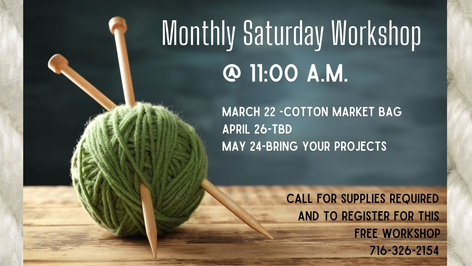 Some supplies are free to our patrons, please call to reserve your spot at 716-326-2154. The supplies required are a crochet hook and two skeins of sugar and cream cotton yarn!