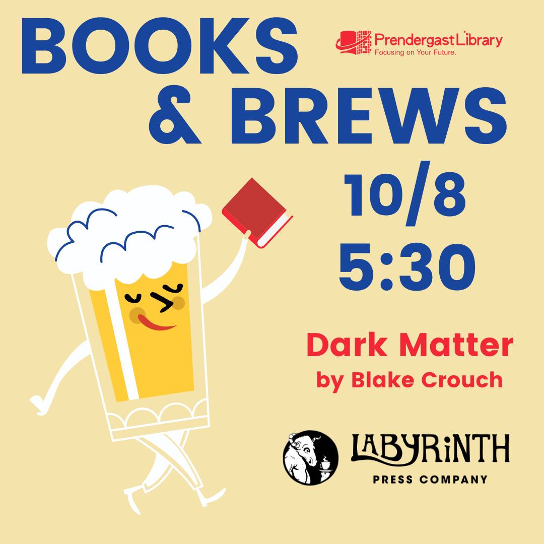 Our October Books & Brews pick is Dark Matter by Blake Crouch! Join us on Wednesday, October 8, at 5:30pm at Labyrinth Press Company for a drink or dinner and some lively book chat with our staff. Check out our website https://www.prendergastlibrary.org/books-brews/ for past reads, book recs, and plans for the future!