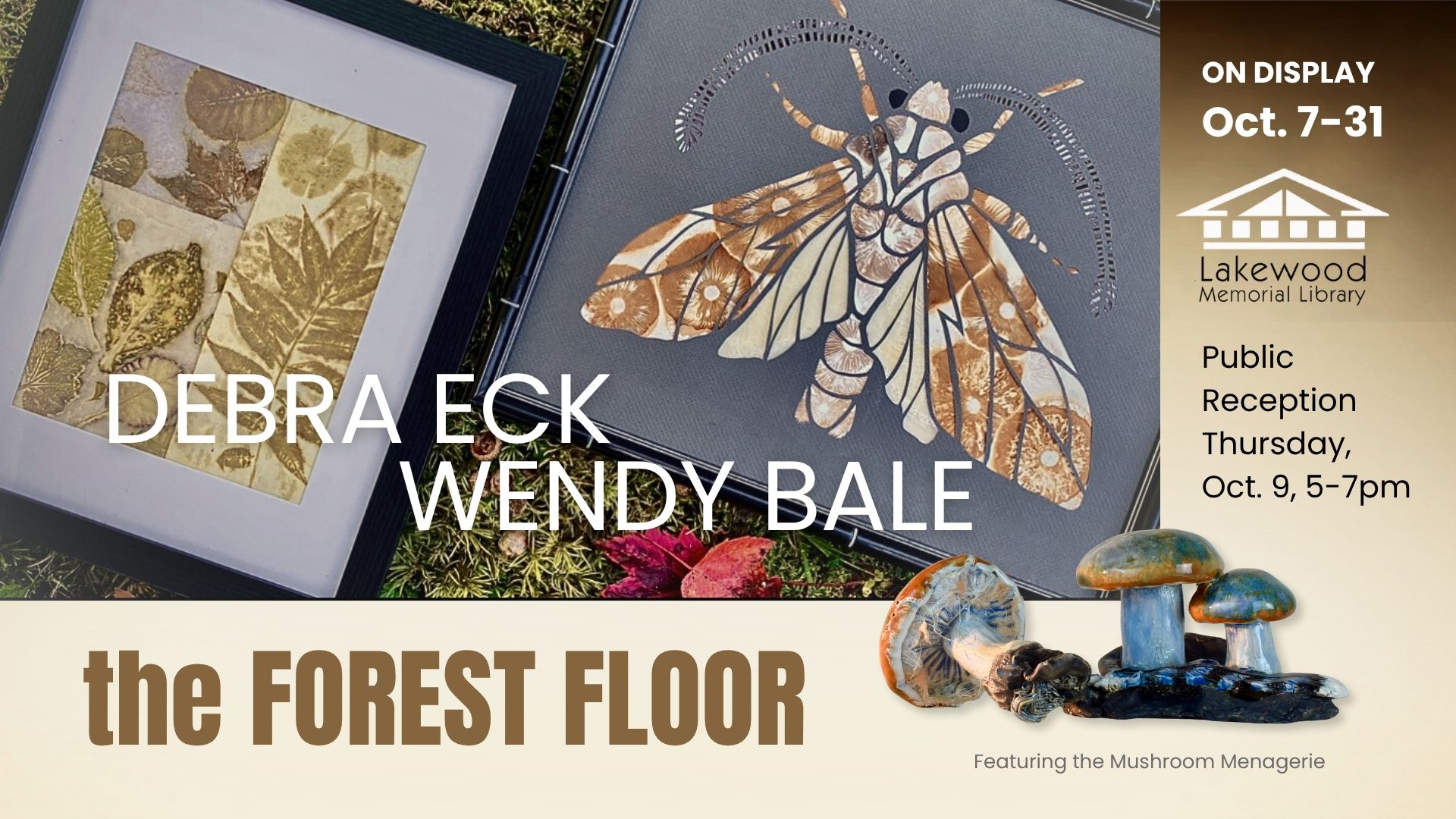 Meet the artists and enjoy light refreshments while we celebrate two artist’s use of natural materials and subject matter found beneath our feet on the forest floor.