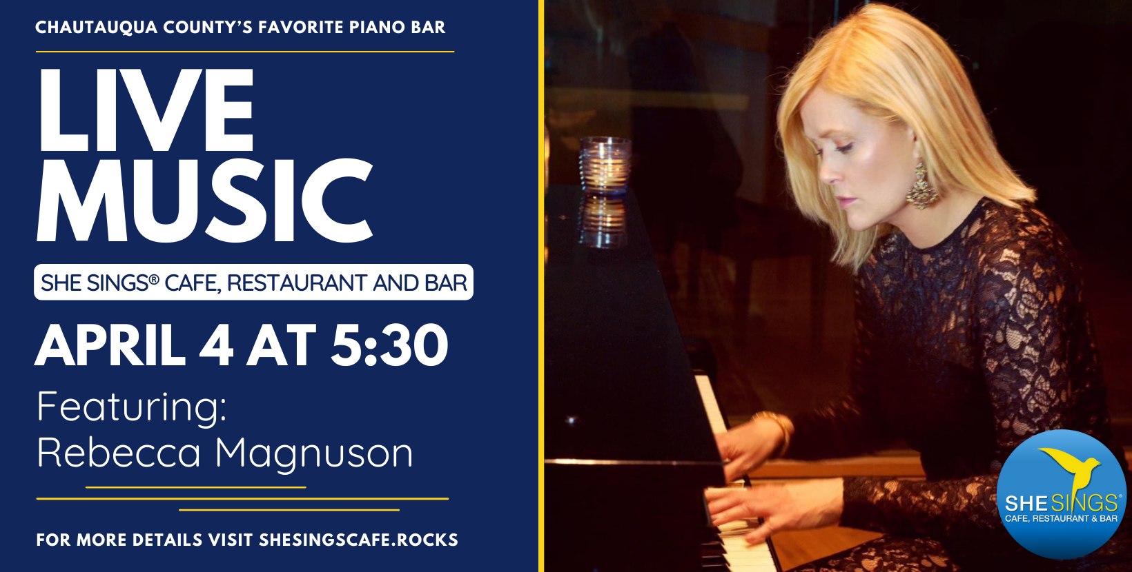 Enjoy dinner and a show at She Sings® Cafe, Restaurant and Bar featuring Rebecca Magnuson at our piano bar!