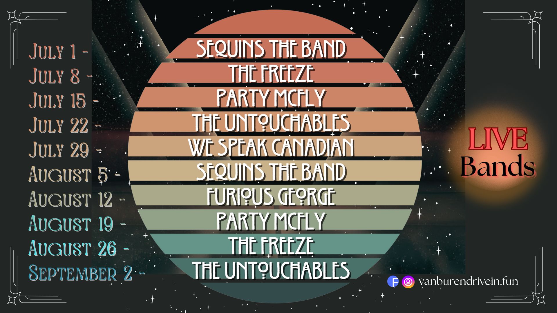 Join us for a fun-filled day of family fun with automobile enthusiasts, retro movies, and live music. All of this for the price of $5 a car! Gates open at 6 pm with a live band performing from 7 – 8:30, followed by a retro movie on the big screen at 9 pm.