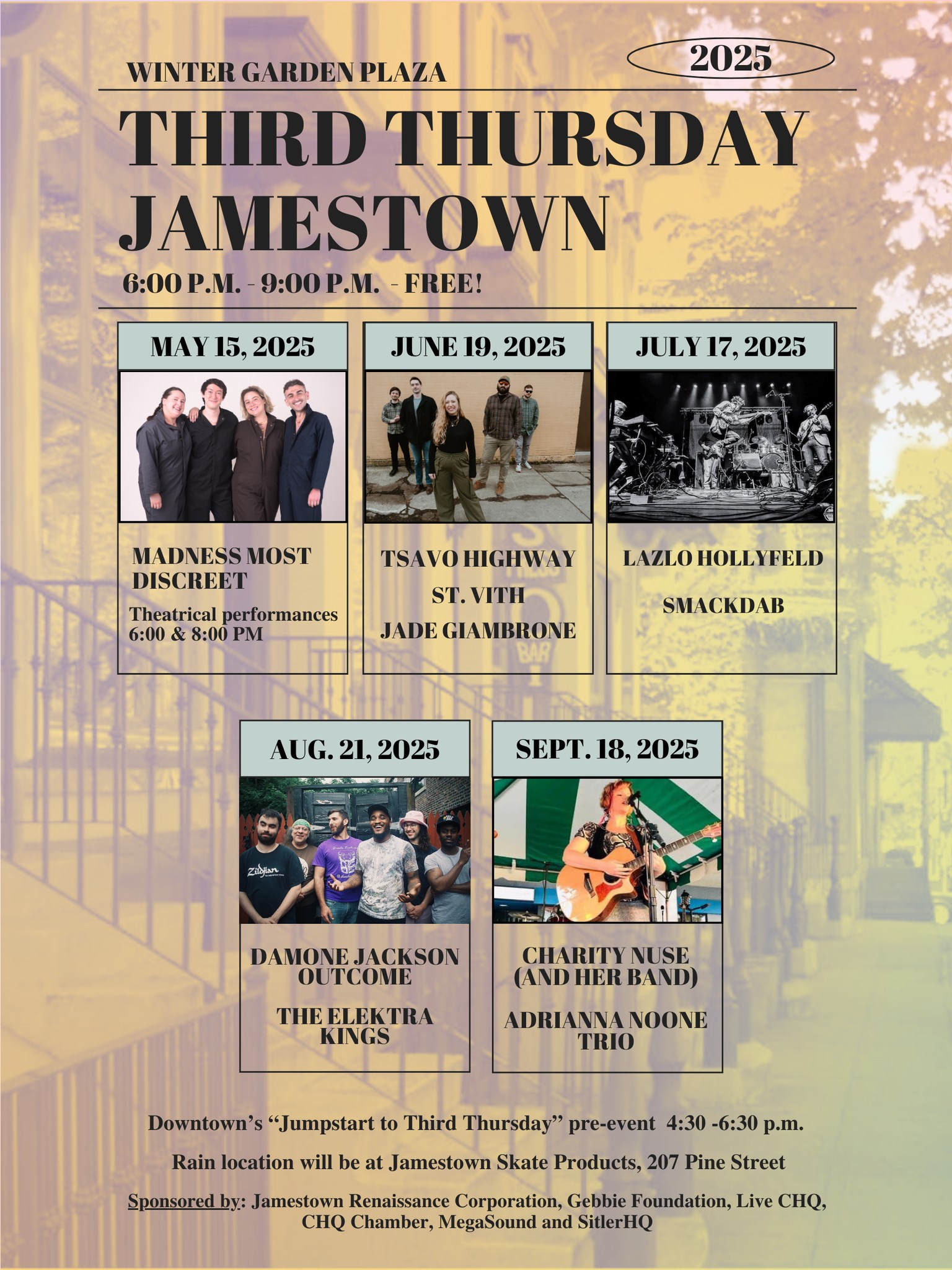 Lineup announcement!!! We’re SO looking forward to the return of Third Thursday Jamestown 2025! Some fresh faces, familiar friends, and a whole lotta fun will be happening back at Winter Garden Plaza in downtown Jamestown.