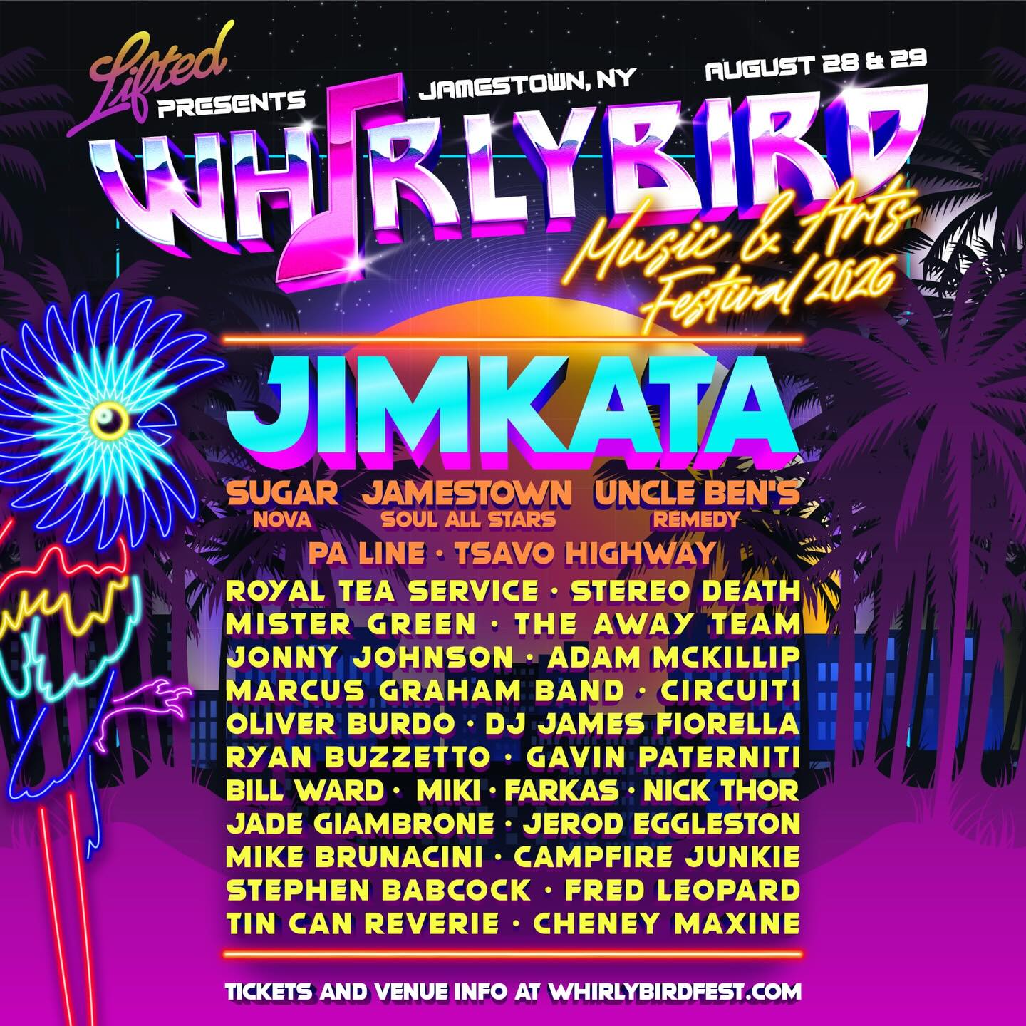The Bird is stoked to bring you one of our freshest lineups in years. Our best buds, Jimkata, return along with a new & exciting cast of artists including Sugar Nova (feat Luke Miller of Lotus) Uncle Ben’s Remedy, Jamestown Soul All Stars (feat members of Smackdab & Porcelain Busdrivers) PA Line, Tsavo Highway, and many more! We’ll be featuring live music at NINE different downtown venues including our FREE, ALL AGES community street festival both Saturday & Sunday at Winter Garden Plaza. Great bands, craft vendors, and delicious local eats! Big thanks to Lifted and all our amazing sponsors and venues for their ongoing support! 2-Day Early Bird passes available at whirlybirdfest.com