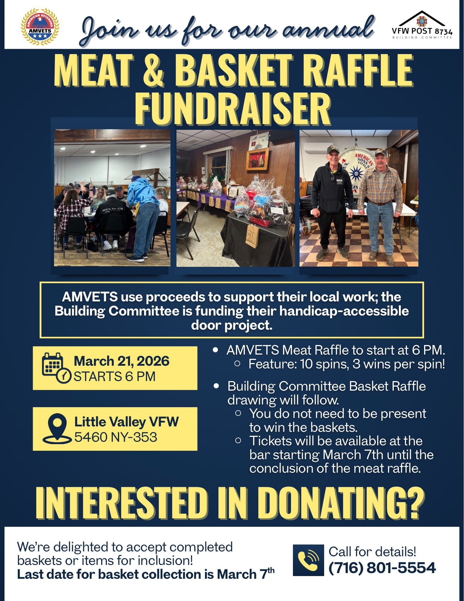 MEAT & BASKET RAFFLE FUNDRAISER Join us for a fun night out while supporting great local causes! The AMVETS Meat Raffle and VFW Post 8734 Building Committee Basket […]
