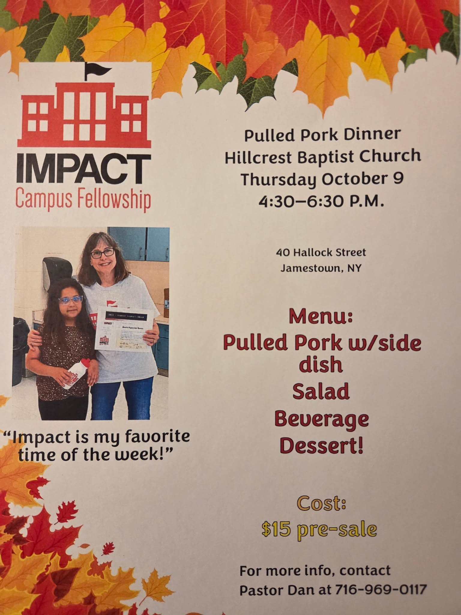Join us for a great dinner and support another great year of ministry to students! Eat in or Take Out!