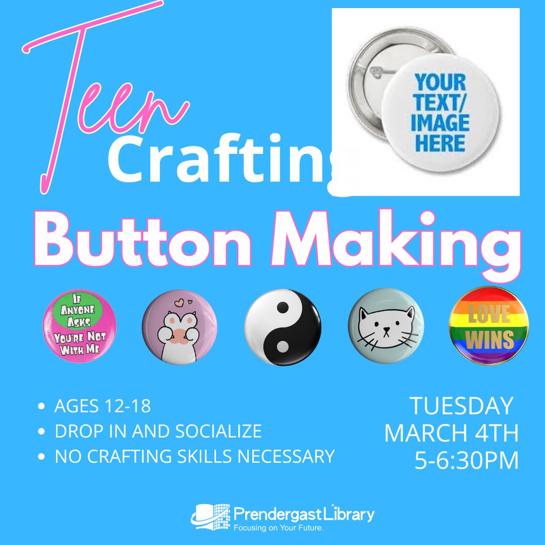 Stop by Teen Crafting on Tuesday, March 4th from 5:00-6:30 for button making! All supplies are provided by the library. No registration is required for this free, weekly […] |