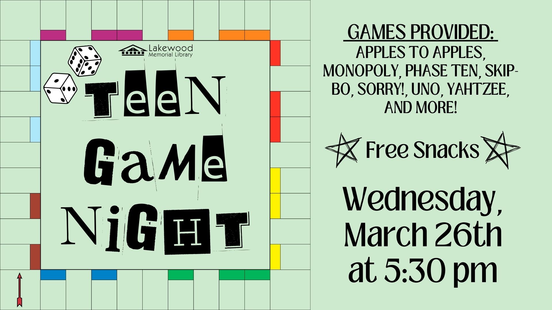 Join us on Wednesday, March 26th at 5:30pm for Teen Game Night—there will be snacks, drinks, and a variety of board games to play. It’s a great way […]