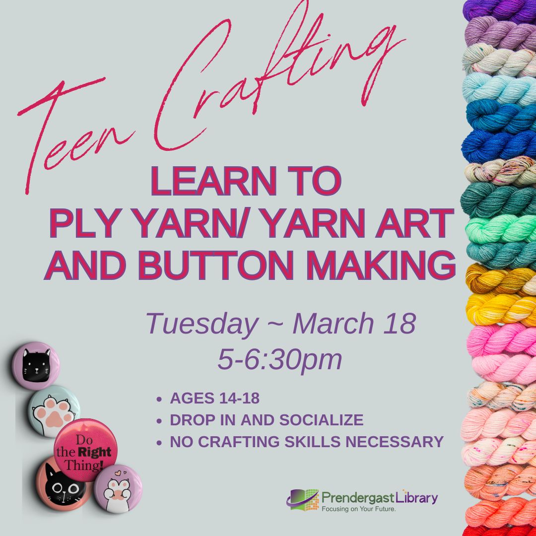 Stop by Teen Crafting on Tuesday, March 18 from 5:00-6:30 to learn to ply yarn and make yarn art and for button making! All supplies are provided by […] |