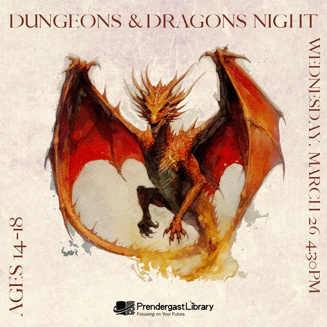 Join us Wednesday, March 26 at 4:30pm for our monthly D&D night! Ages 14-18 welcome, snacks provided!