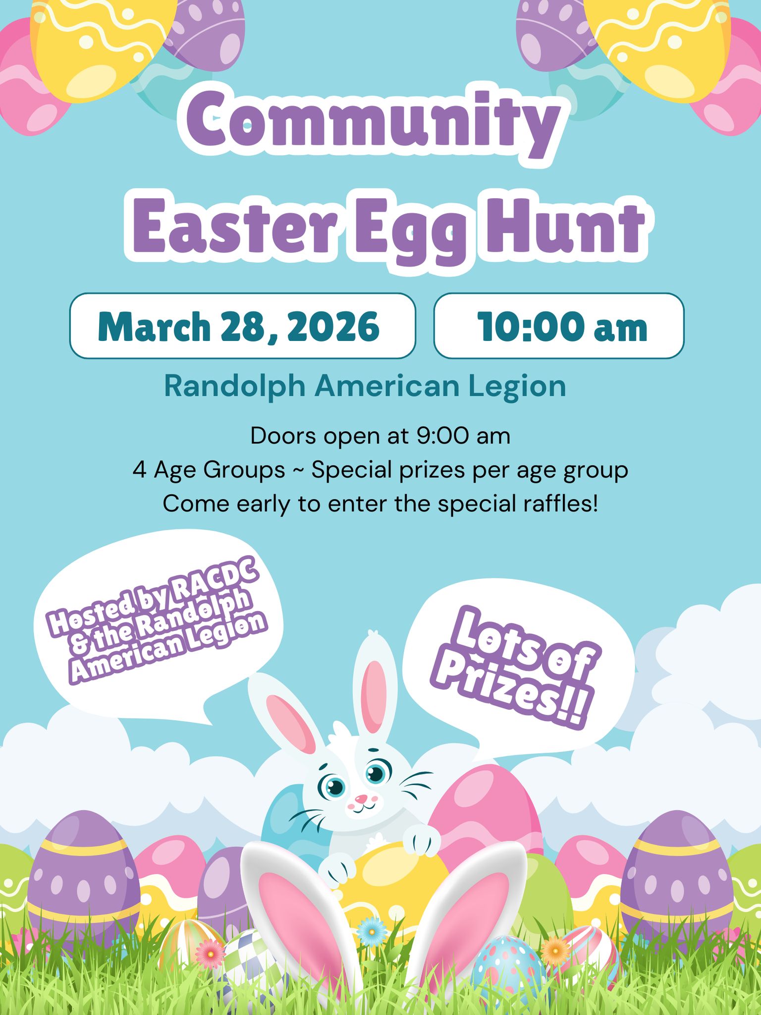 Community egg hunt at the Randolph American Legion! There will be 4 age groups with special prizes for each group!