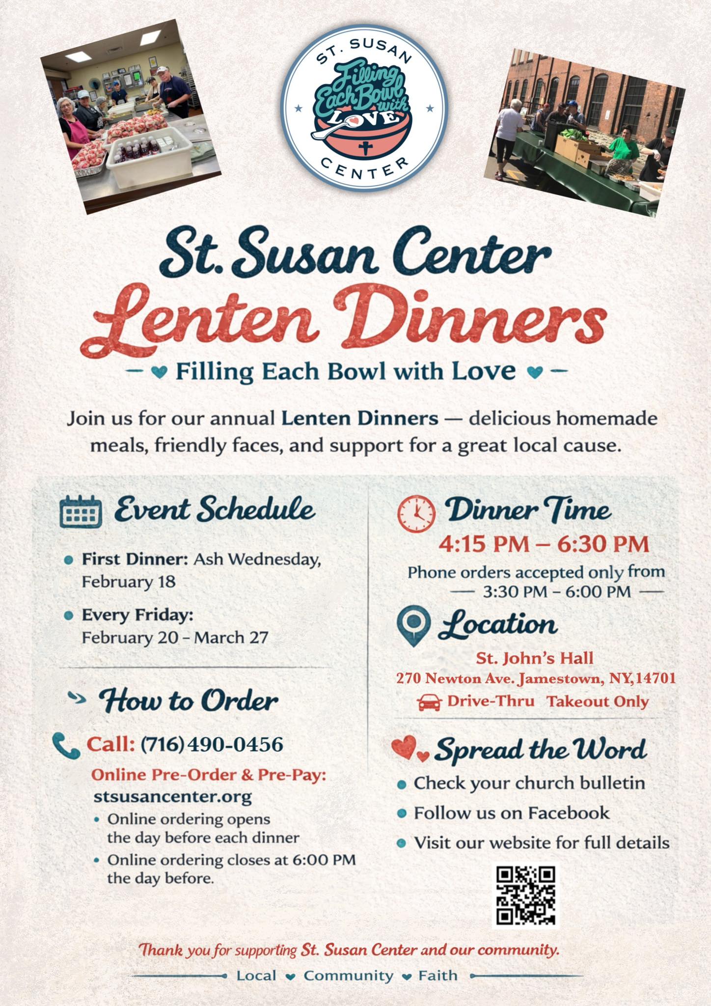 Head down to St. John’s for your Lenten take out dinner! Call 7164900456 or come down 270 Newton Avenue!