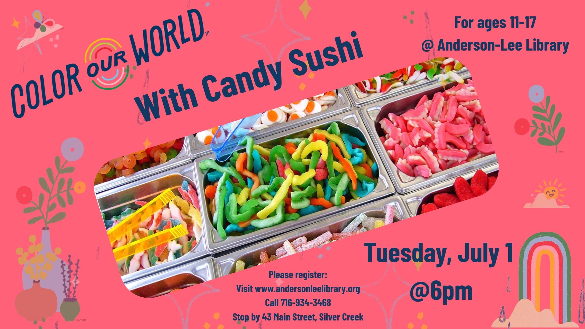 Make Your Own Candy Sushi, for ages 11-17. Using a variety of candy, we will create our own delicious candy sushi. Registration is required. Please visit www.andersonleelibrary.org