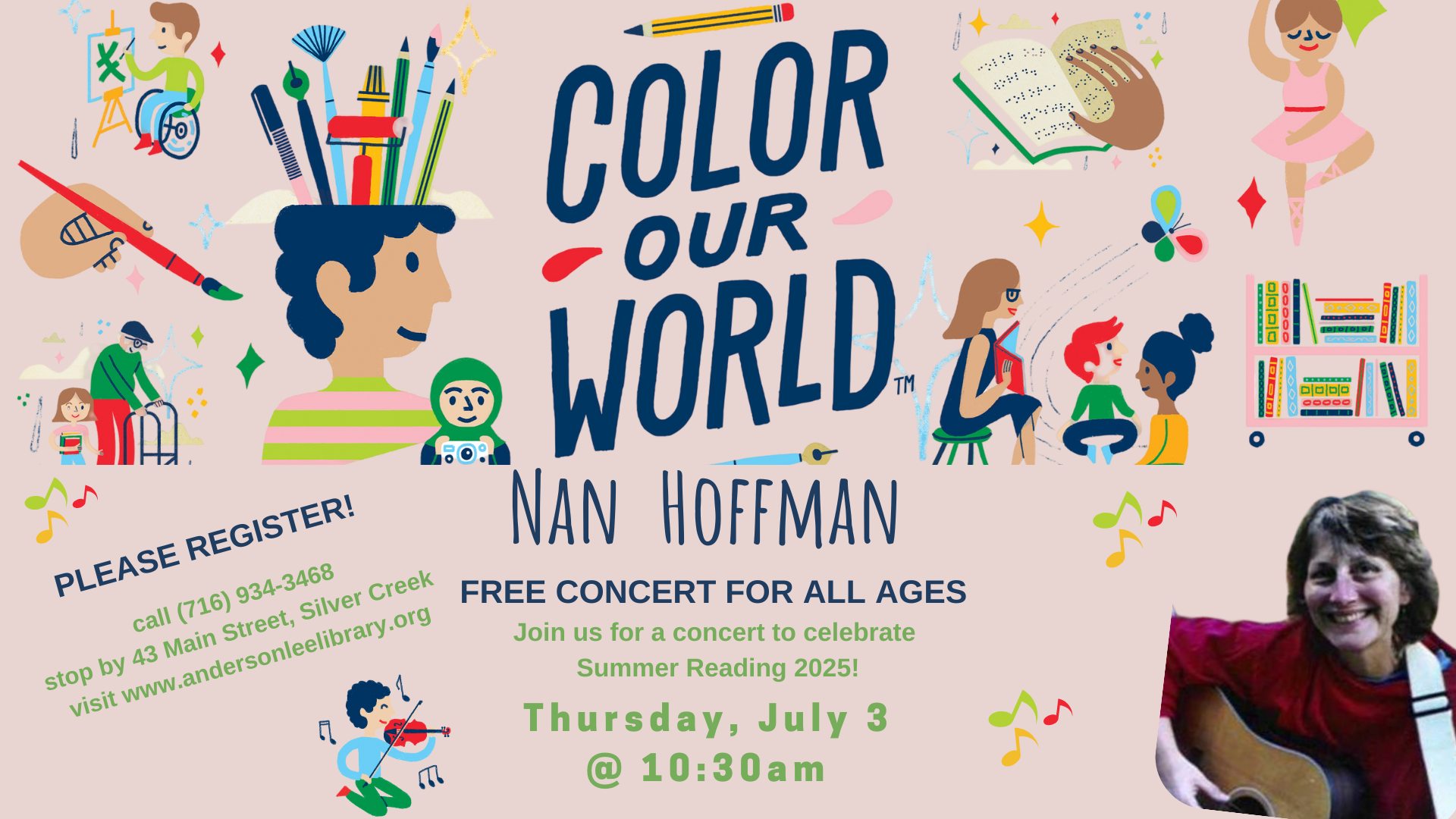 Color Our World with Music! Join us for our annual concert with musician Nan Hoffman! She will help us kick off our summer reading program “Color Our World”! […]