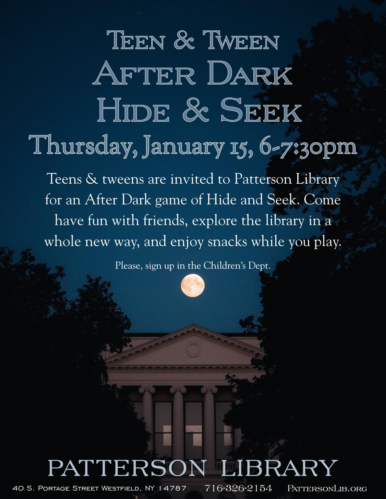 Teens & Tweens are invited to join us on Thursday, January 15, 6-7:30pm for After Dark Hide & Seek! Come have fun with friends, explore the library in […]