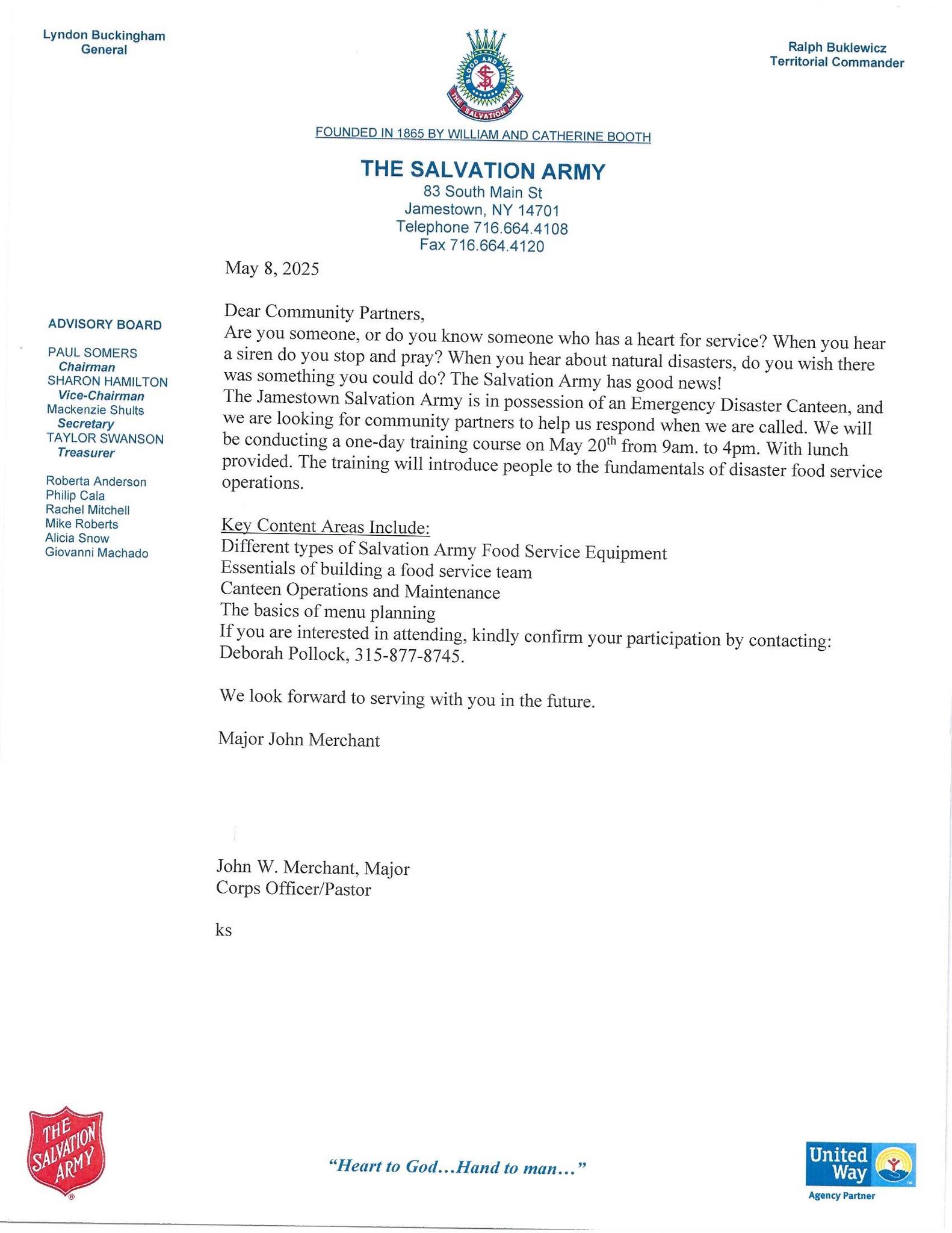 The Salvation Army - Jamestown 83 S Main St, Jamestown, United StatesThis one-day training will help you prepare for emergency disaster scenarios with content like: Types of Salvation Army Food Service Equipment Essentials of building a food service team […]