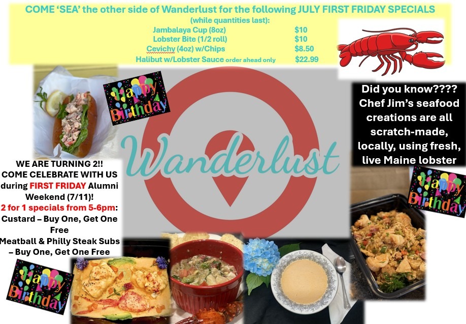 Wanderlust Custard & Carryout Cuisine 29 Elm St, Westfield, United StatesWE'RE TURNING TWO! Come celebrate with us, THIS Friday, 7/11......First Friday AND Alumni Weekend. Enjoy 2 for 1 specials from 5-6 pm on some of your Wanderlust faves. […]