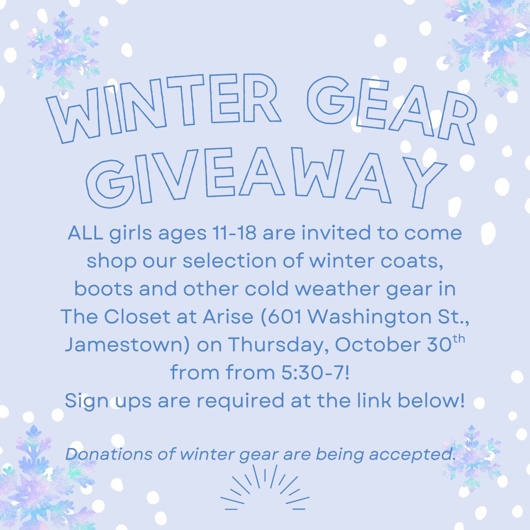 Arise Chautauqua House 601 Washington St, Jamestown, United StatesWe’re excited to invite 15 girls (ages 11-18) to our first Life-Skills class of the 2025-2026 program year, Unmasked Discovering your Inner Superpowers with Denise DeAngelo, Enneagram Coach […]