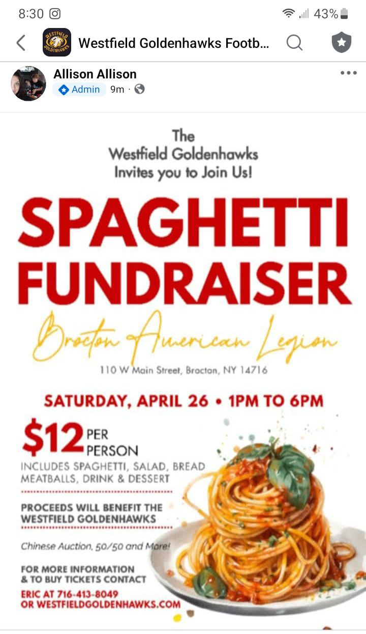 Come join the Westfield Goldenhawks Football and Cheer for a Spaghetti Dinner Fundraiser. All proceeds go to the organization for the Players and Cheerleaders. Please Join us April […]