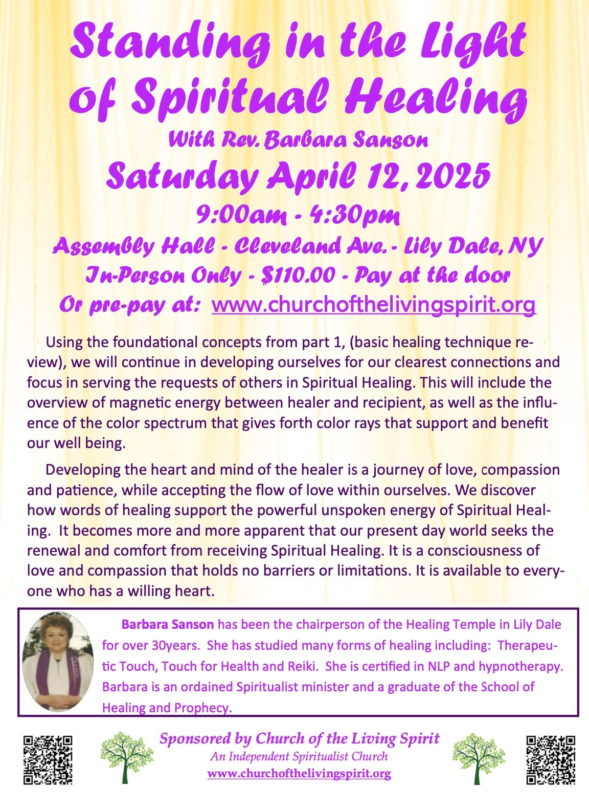 Church of the Living Spirit 1 Liberty St, Lily Dale, United StatesJoin us for free coffee and treats at the Lily Dale FireHall. We will also offer $10.00 ~ 10 minute Mini Readings by Mediums. Buy your tickets for […]
