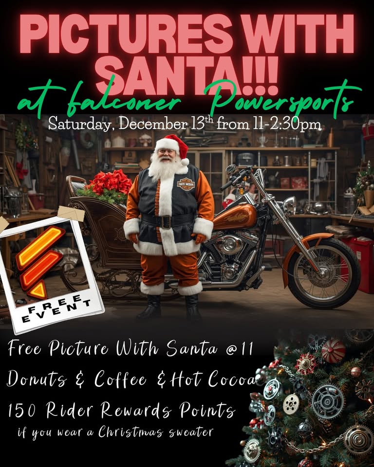 Free picture with Santa Claus! Coffee, donuts, and hot cocoa available. 150 Rider Rewards Points for wearing Christmas sweater - redeem with Motorclothes® More details coming soon!