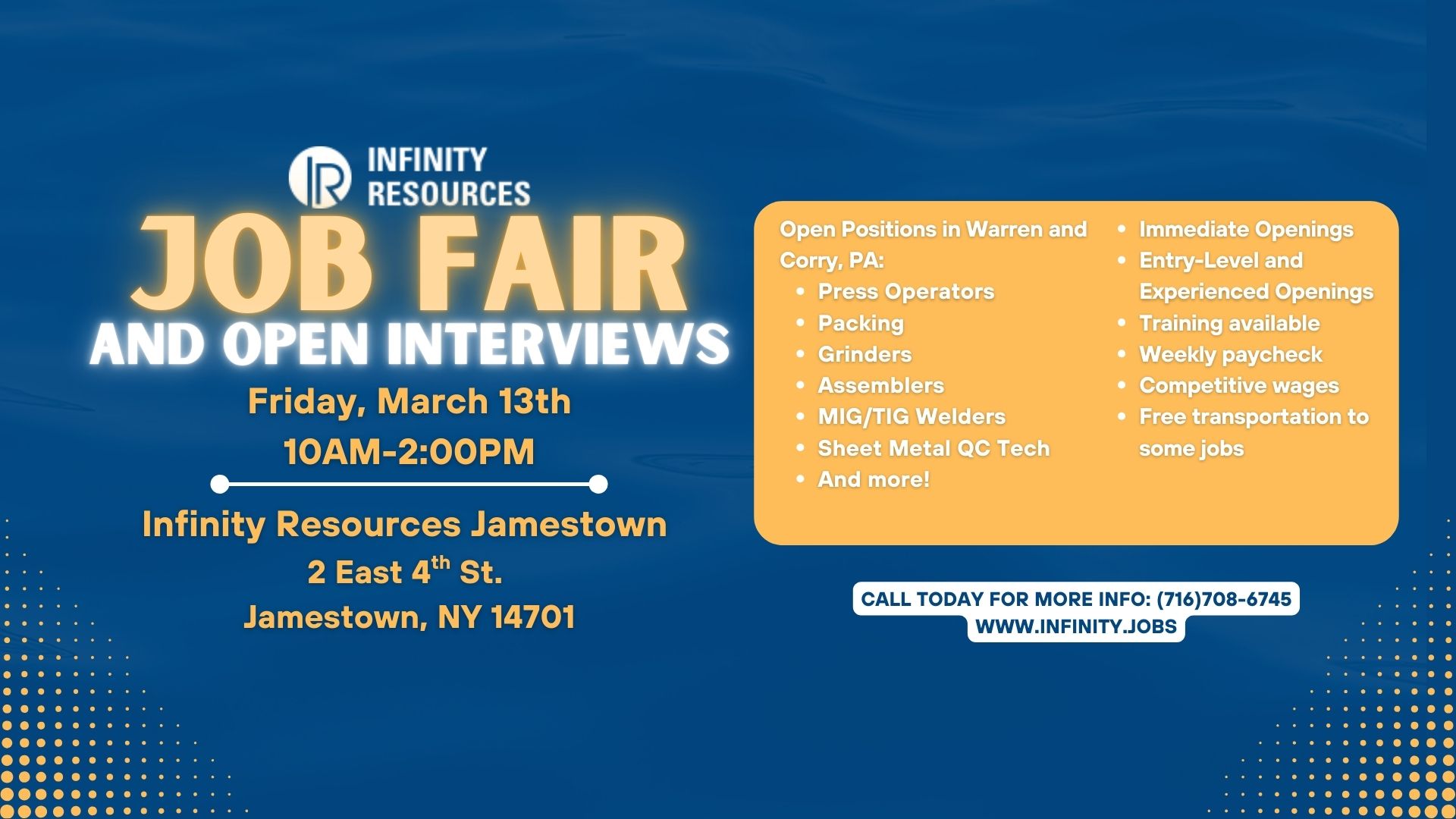 JOB FAIR & OPEN INTERVIEWS – JOIN US! Looking for your next opportunity? Infinity Resources is hosting a Job Fair and Open Interviews at our Jamestown office — […]