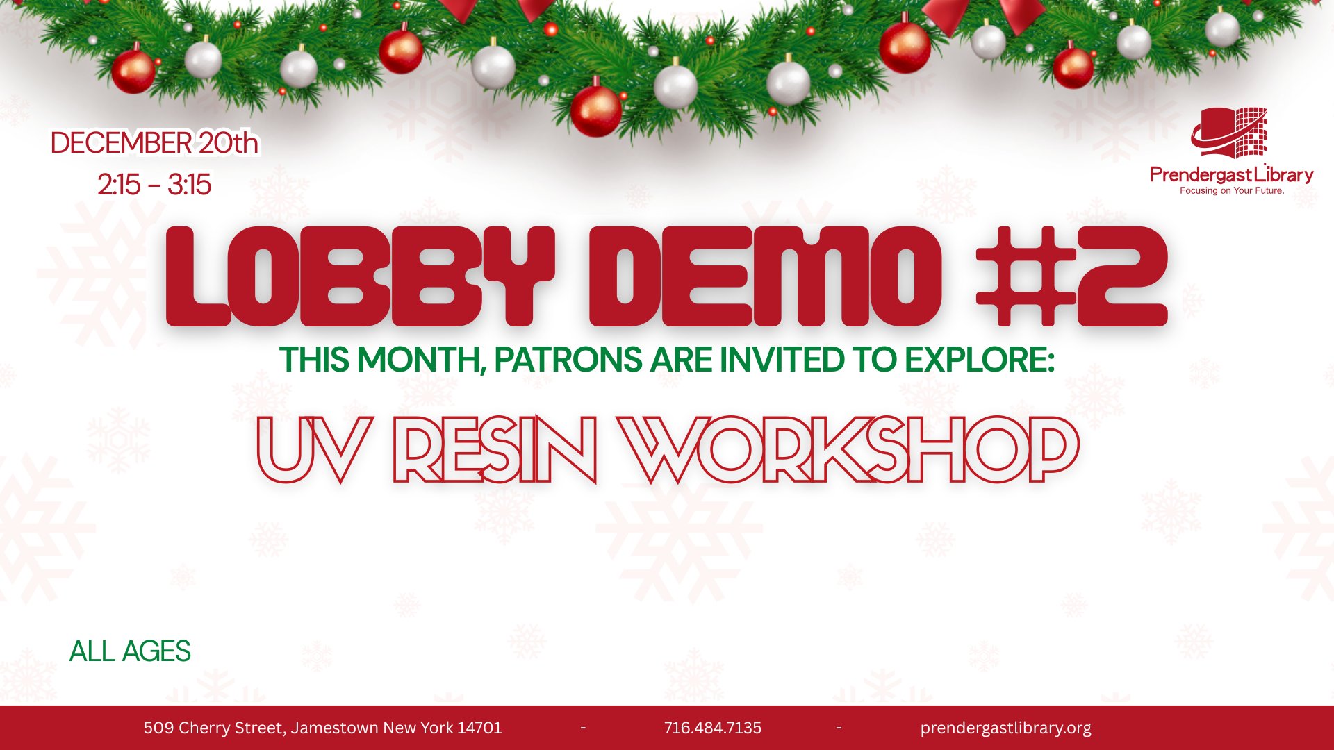 Join us on December 20th from 2:15-3:15 for a UV Resin Workshop!Learn how to mix resin and use a UV light to solidify it! We hope to see […]