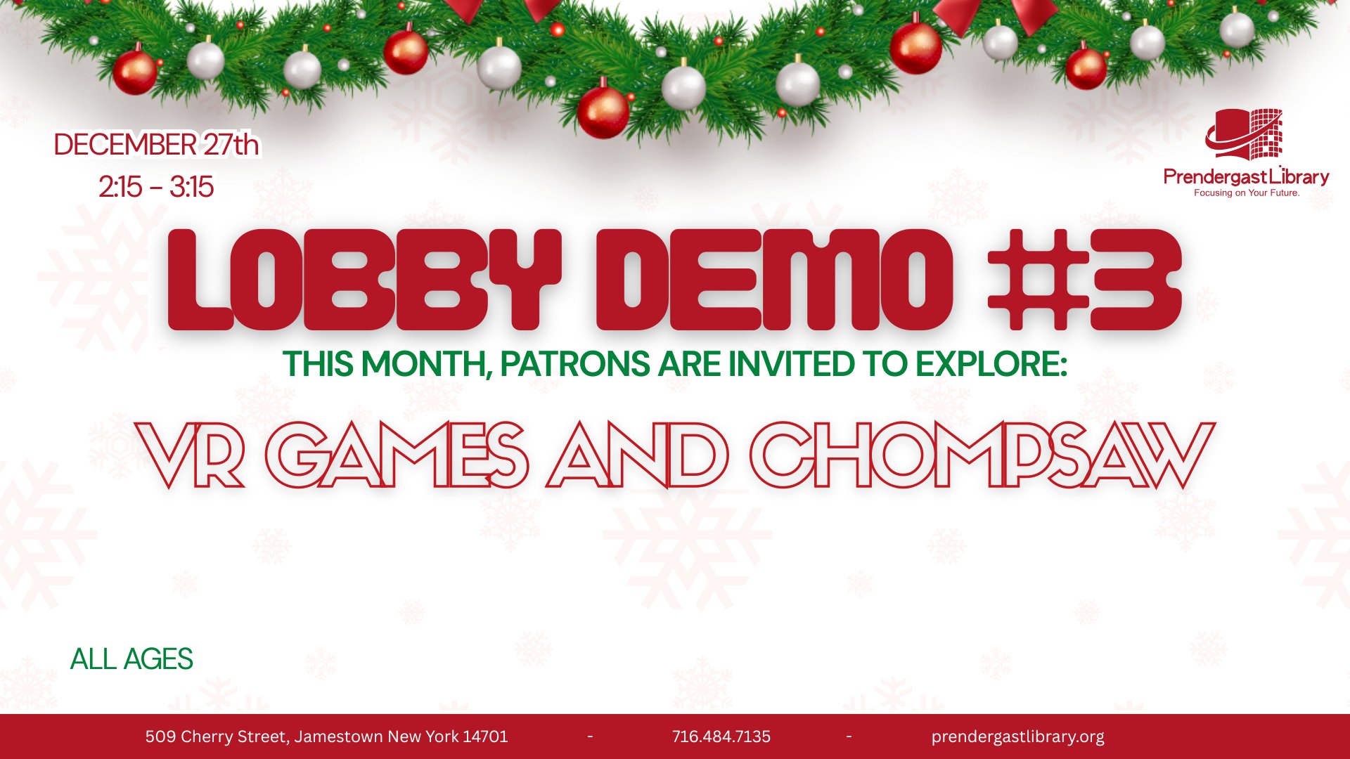 Join us at the library on December 27th from 2:15-3:15 to try out our VR headsets and mess around with the chomp saw to make some crafts!