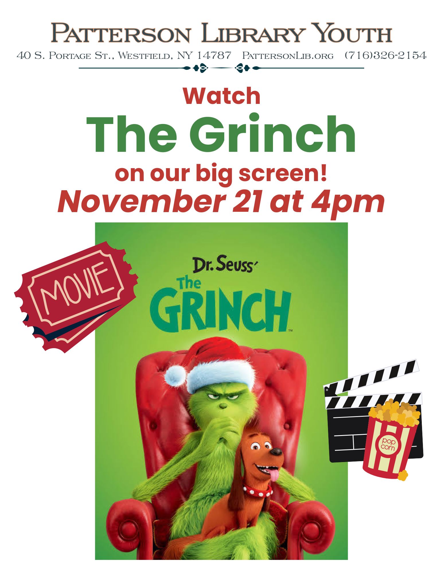 Join us for Christmas in the Village and watch "The Grinch" with us on November 21 at 4pm! Add the date to your calendar so you don't forget.