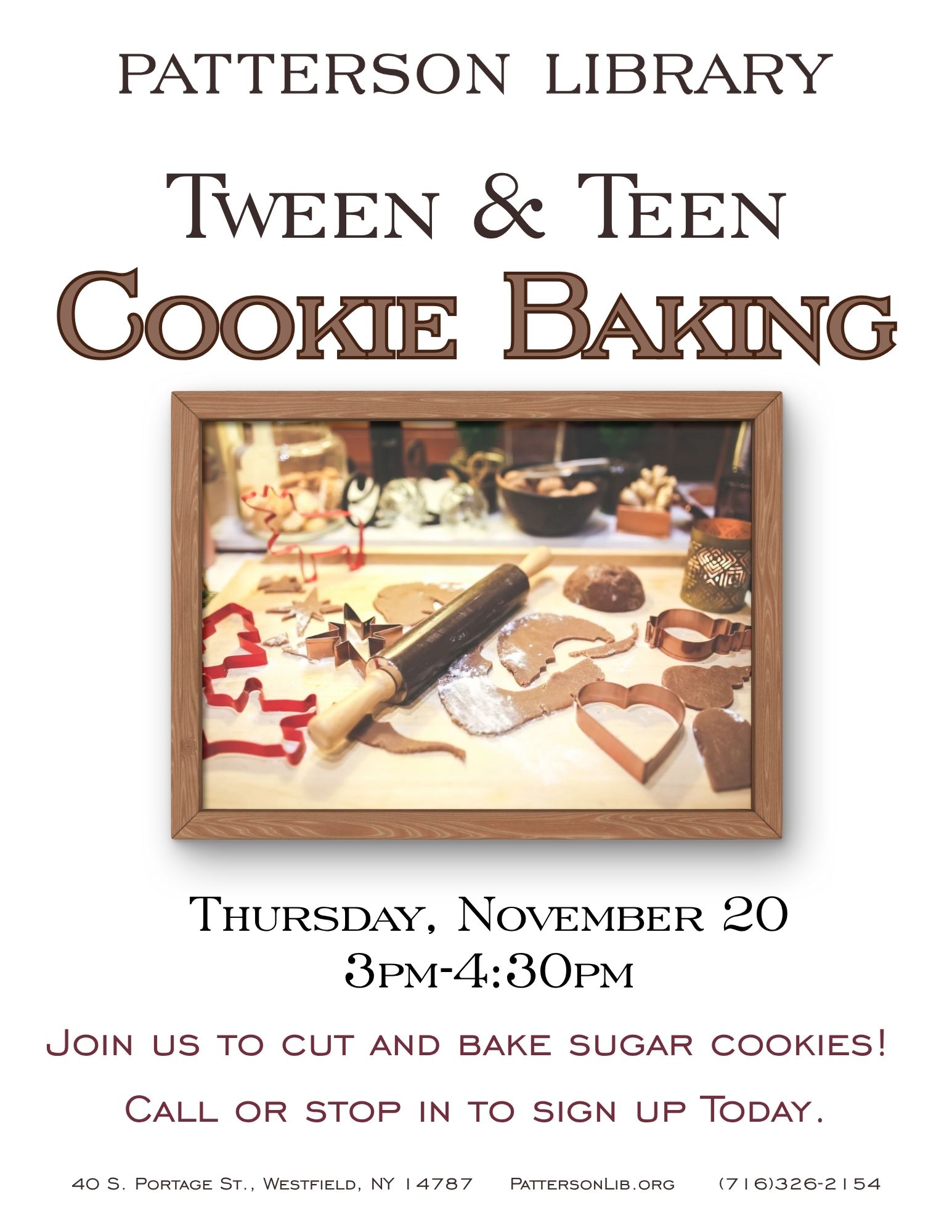 Tweens & teens are invited to sign up and join us on November 20 at 4pm for sugar cookie baking! Call and sign up today