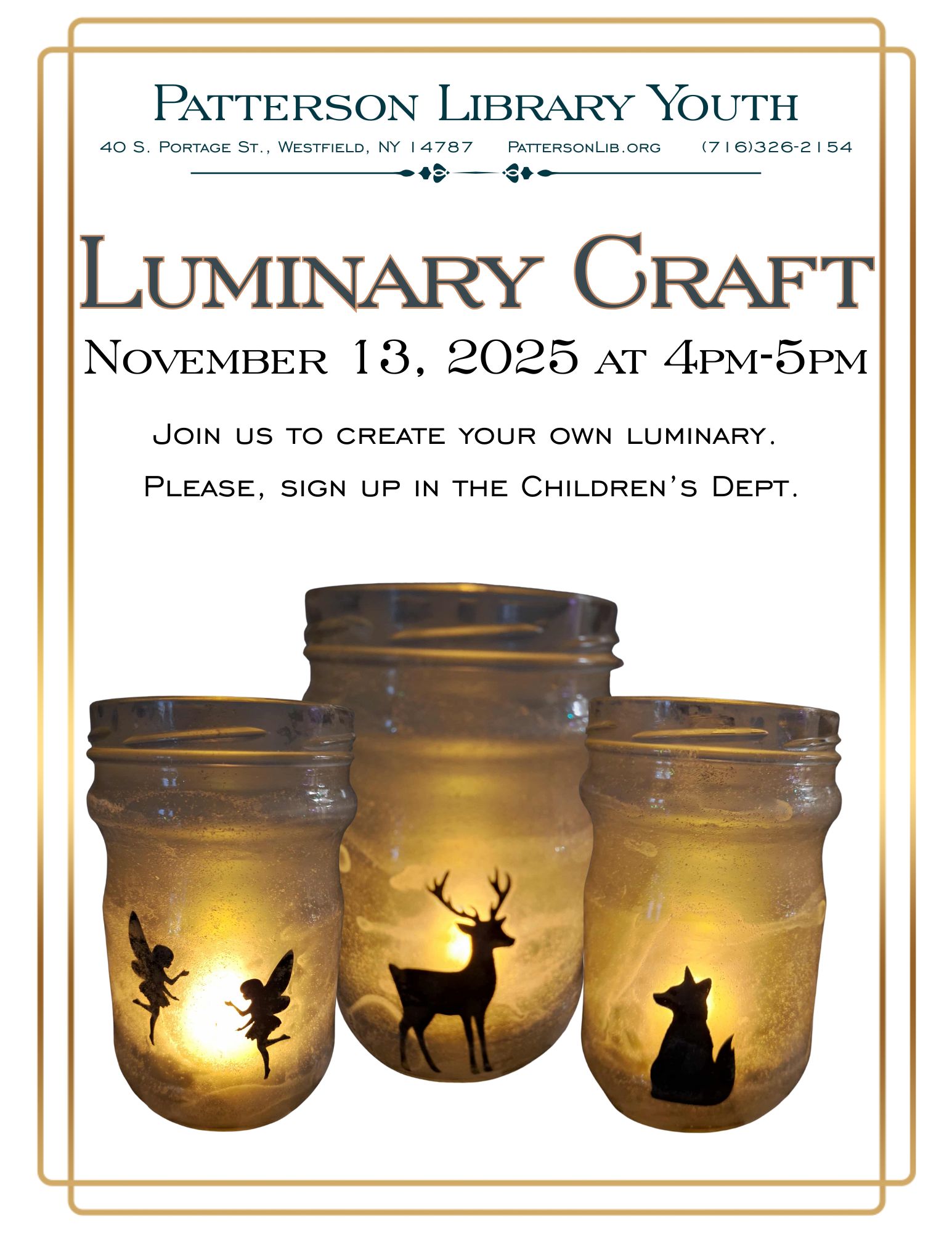 Teen & tweens are invited to join us to make a luminary on November 13 at 4 pm! Call or stop in to sign up today.