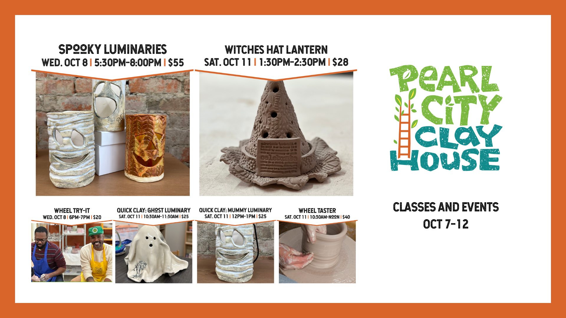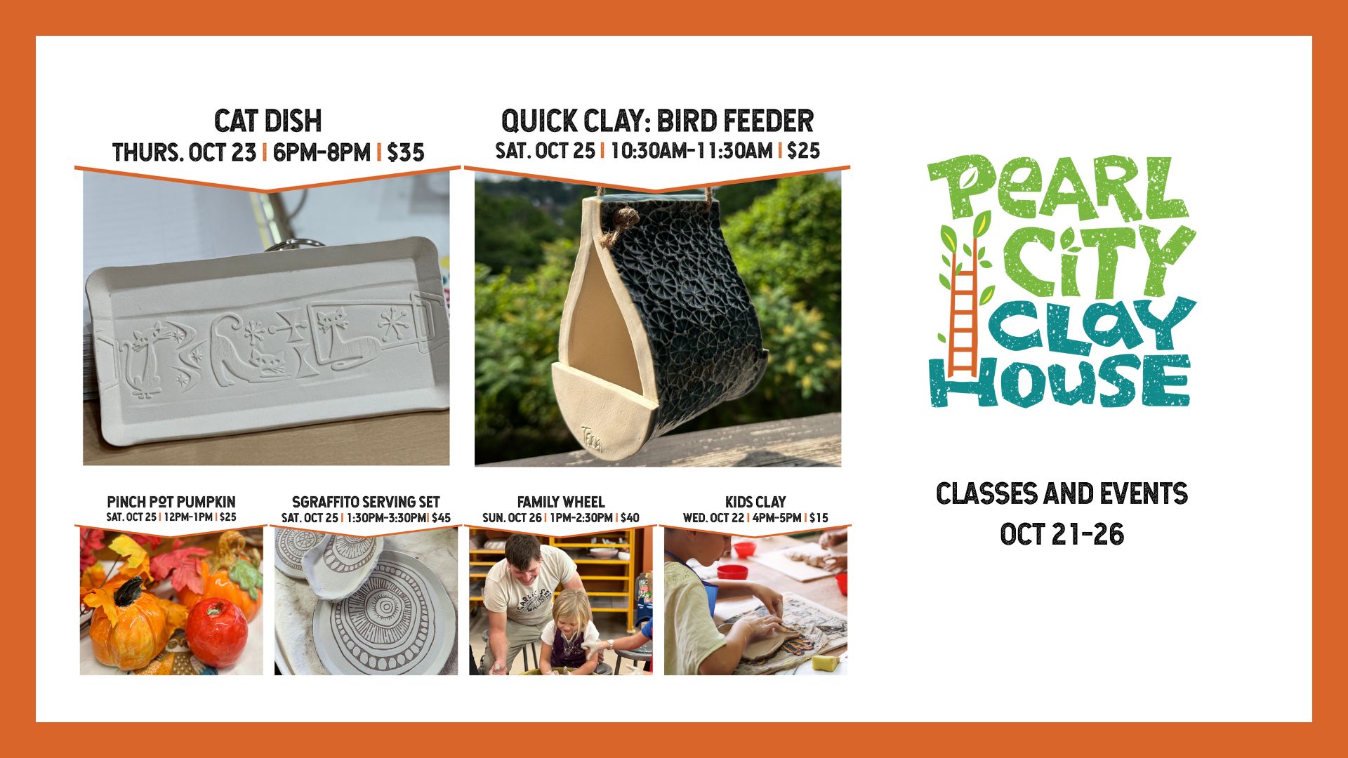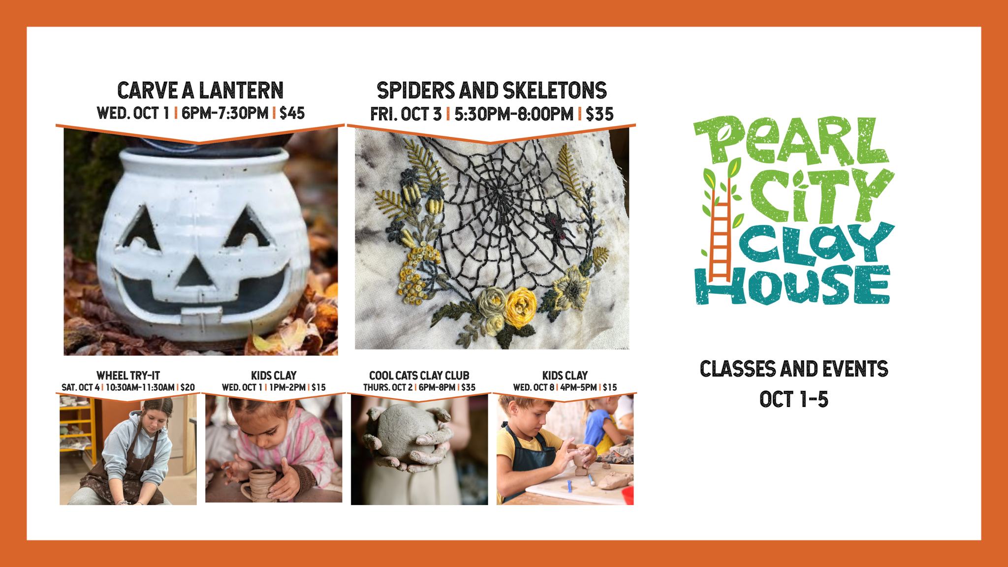 Pearl City Clay House 220 East 2nd St., Jamestown, NY, United States10/28/2025 SPIDERS/SKELETONS 5:30-8PM $30.0010/28/2025 WHEEL TASTER 6-7:30PM $40.0010/29/2025 KIDS CLAY 1-2PM $15.0010/29/2025 CARVE A LANTERN 6-7:30PM $45.0010/30/2025 COOL CATS CLAY CLUB 6-8PM $35.0010/31/2025 Gallery Closing: Member's Exhibition FREE10/31/2025 […]