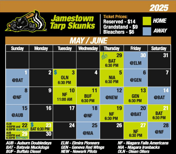 This event listing is for the July part of the schedule! Tarp Skunks Fans, it's time to get stinky The promotional schedule for Chautauqua County's best summer entertainment […]