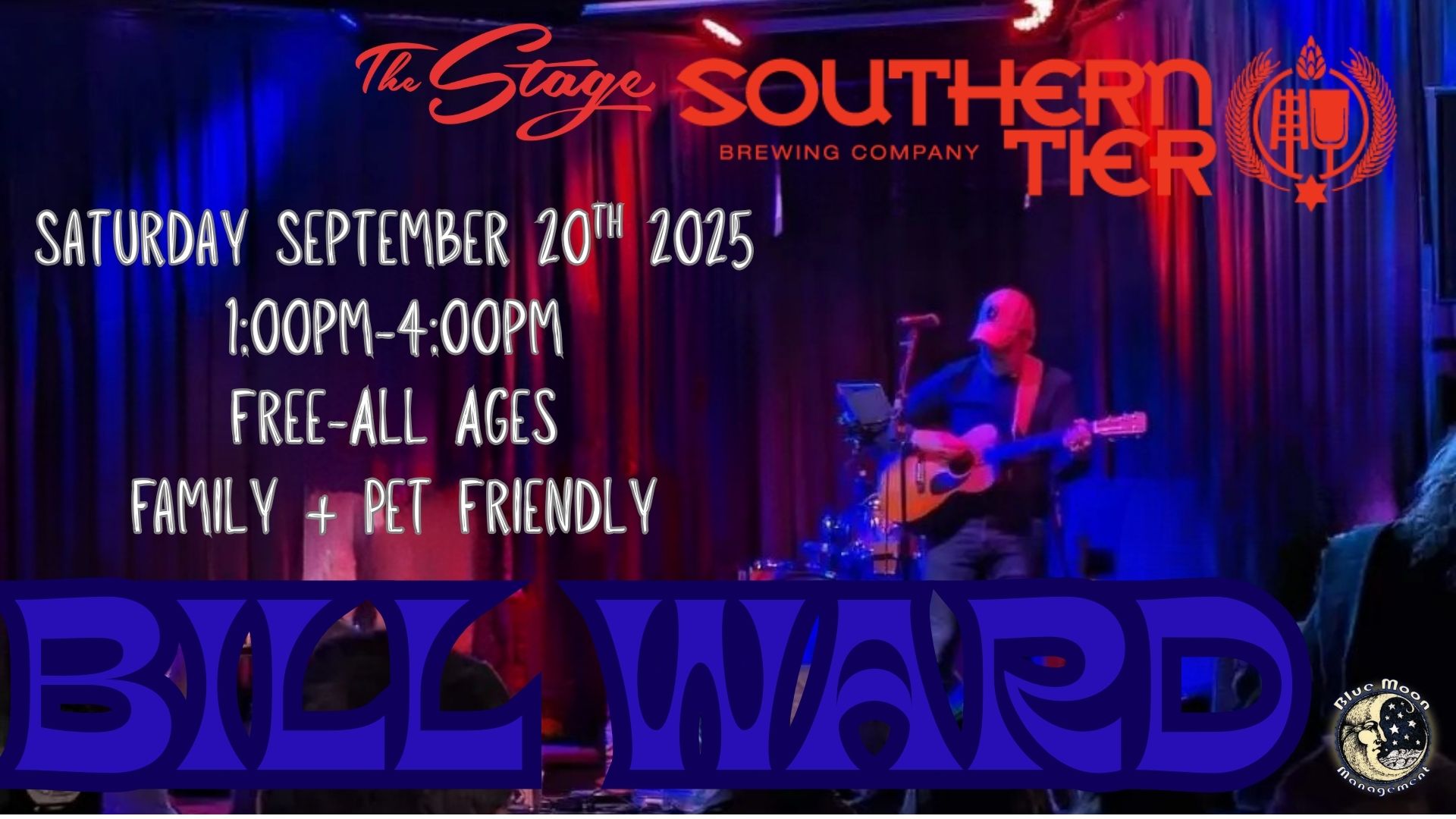 ANNOUNCING.... "BILL WARD" LIVE Saturday September 20th 2025Stage at Southern Tier Brewing2072 Stoneman CircleLakewood, NY 147501:00pm-4:00pmAll Ages-FreeFamily & Pet Friendly