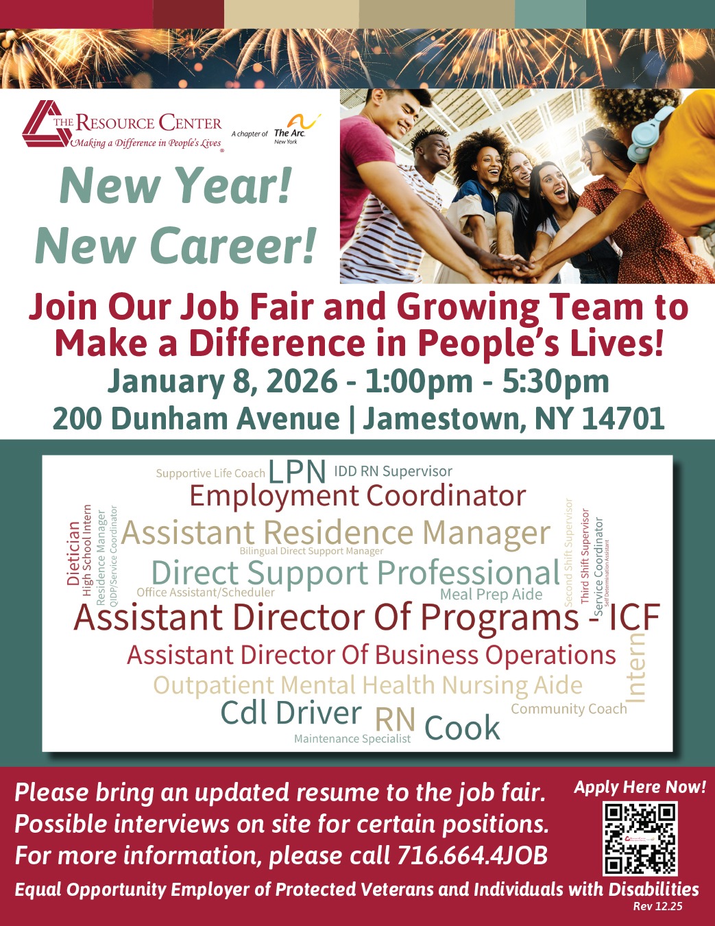 The Resource Center - Jamestown 200 Dunham Ave, Jamestown, United StatesJoin Us for our Career Job Fair in the New Year Do you have a strong desire to Make a Difference in People's Lives? Attend our Job Fair […]