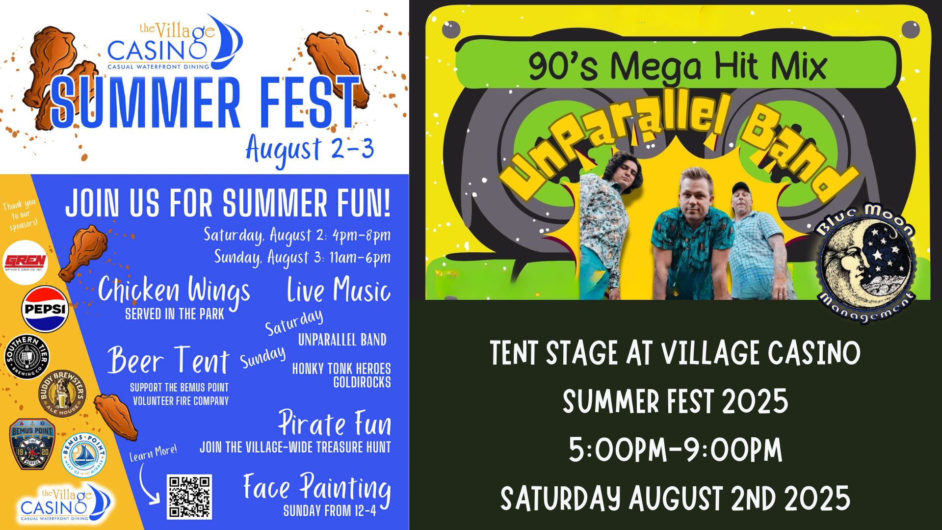 Summer Fest 2025 "UnParallel Band'LIVESaturday, August 2nd, 2025Tent Stage at Village Casino1 Lakeside DriveBemus Point, NY5:00 pm-9:00 pm (UnParallel Band)Free-All Ages-Family Friendly